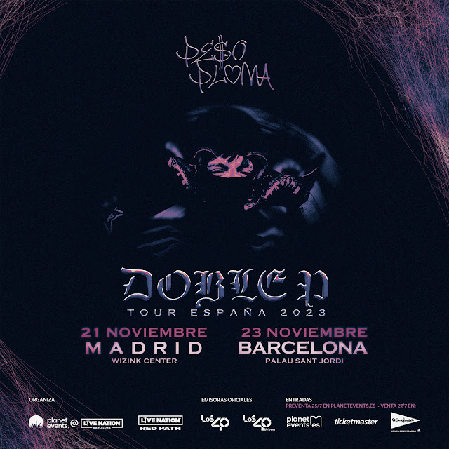 Peso Pluma actuará por primera vez en España, presentando su gira mundial «Doble P«, de la mano de Planet Events Live Nation. Los conciertos tendrán lugar el 21 de noviembre en el Wizink Center de Madrid y el 23 en el Palau Sant Jordi de Barcelona.